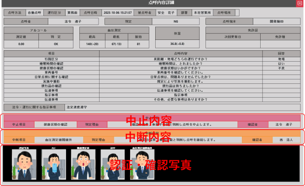 点呼中断・点呼中止判定項目がある場合、項目内容や対応した管理者名など詳細も確認できます。