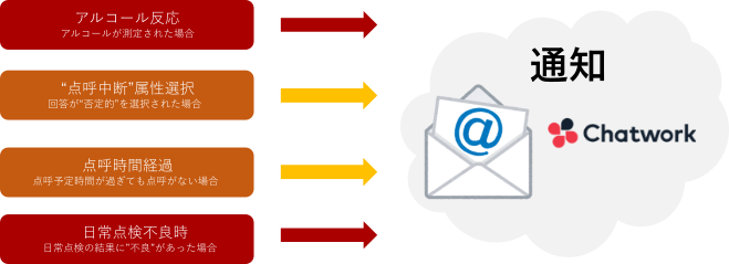 「アルコール反応時」・「日常点検結果不良時」・体温測定閾値外・血圧測定閾値外・点呼中断属性選択時・免許証有効期限切れ・点呼予定時間経過時にアラート通知としてメールまたはSNSであらかじめ登録された管理者へ通知されます。